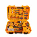 | 1 Pcs 20V cordless impact drill(CIDLI20668) 1 Pcs 2.0Ah battery pack(FBLI20011 ) 1 Pcs charger(FCLI2001 ) Charge volts: 220V-240V~50/60Hz Max impact rate: 22500bpm 1 Pcs 8oz claw hammer 1 Pcs SL5.5×100 screwdriver 1 Pcs PH1x100 screwdriver 1 Pcs 7″ combination pliers 1 Pcs 6″ long nose pliers 1 Pcs 8″ adjustable wrench 1 Pcs test pencil 1 Pcs 3m steel measuring tape 1 Pcs snap-off blade knife 1 Pcs 1/4″ 100mm magnetic shank 1 Pcs 4mm precision screwdriver handle 10 Pcs precision screwdriver bits:SL1.5,SL2,SL3,PH000,PH00,PH0,T6,T8,H1.5,H2.5 1 Pcs 5.5″ electrician’s scissors 1 Pcs mini hacksaw frame 8 Pcs Hex key:1.5,2,2.5,3,4,5,5.5,6mm 5 Pcs masonry drill bits 4,5,6,8,10mm 5 Pcs twist drill bits 2,3,4,5,6mm 4 Pcs wood drill bits 4,5,6,8mm 20 Pcs screwdriver bits SL3,SL4,SL5,SL6,PH0,PH1,PH2,PH3,PZ0,PZ1,PZ2,PZ3,T10,T15,T20,T30,H3,H4,H5,H6 10Pcs 2″ screwdriver bits:SL4,SL5,SL6,PH1,PH2,PH3,T10,T15,T20,T30 7 Pcs power sleeve (Cr-V): 5,6,7,8,9,10,11mm 1 Pcs magnetic bits holder 40 Pcs screws(22pcs*ST3.5,10pcs*ST4, 8pcs*ST5) 40 Pcs plastic plugs(22pcs*5mm,10pcs*6mm,8pcs*8mm) Packed by carrying case |