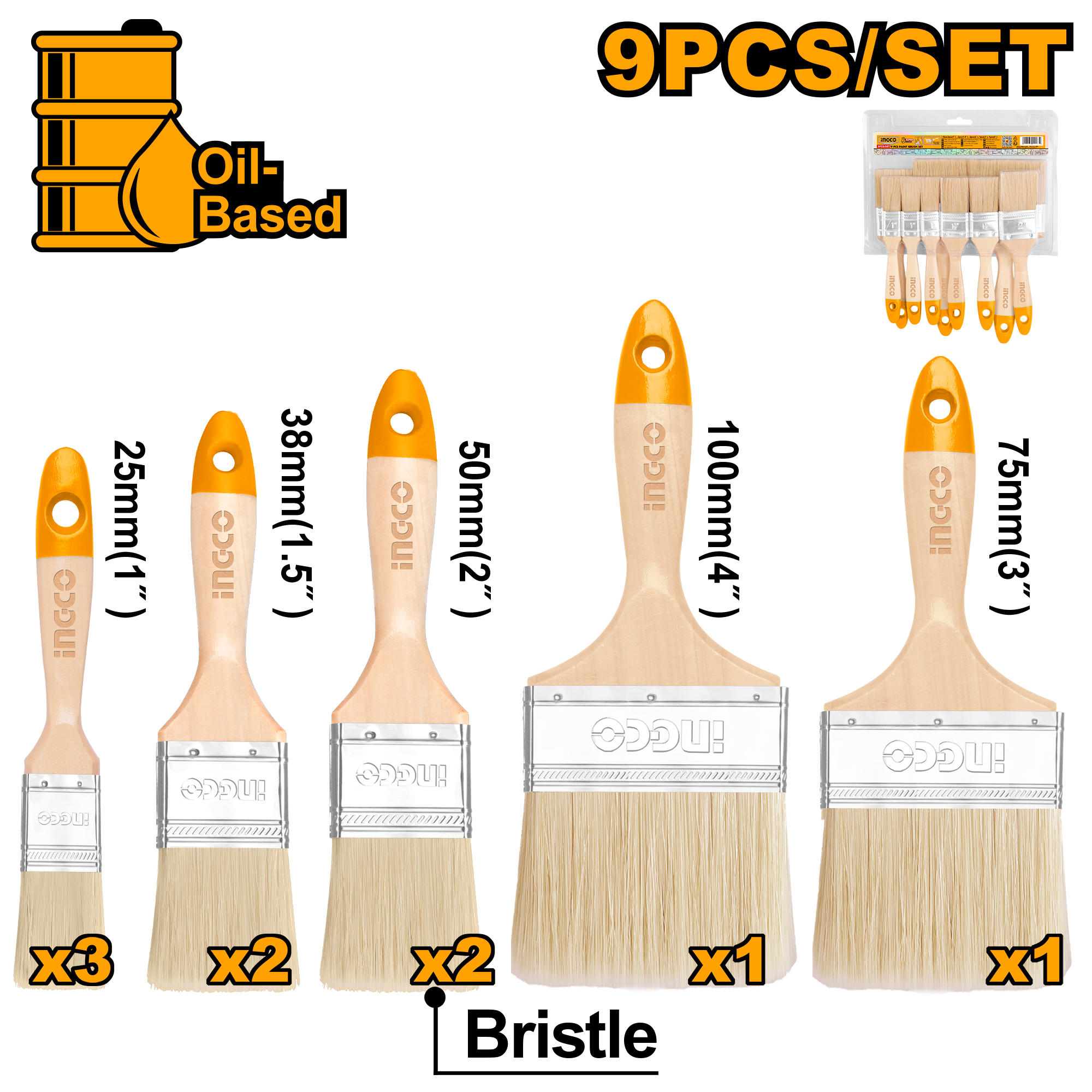 | 9pcs paint brush set For Oil-Based paint 3pcs 1″ 2pcs 1.5″ 2pcs 2.0″ 1pcs 3.0″ 1pcs 4.0″ Wooden handle Packed by double blister |